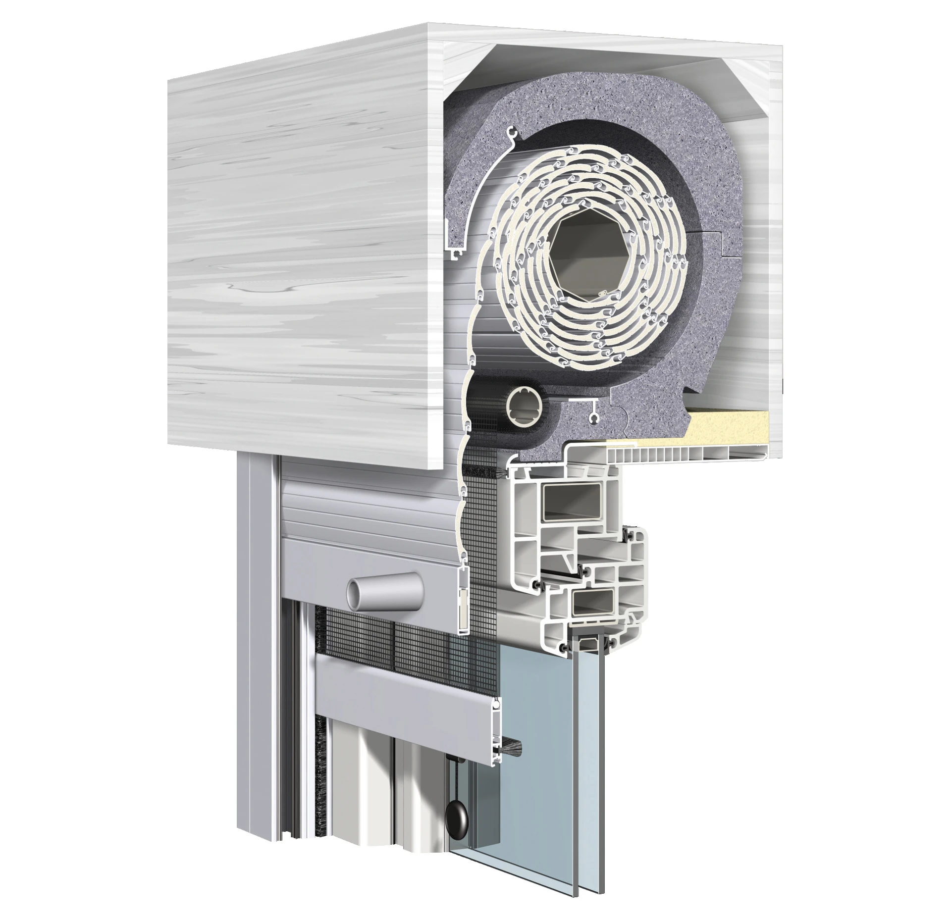 Querschnitt eines Rollladenkastens mit integriertem Fenster und Isolierung