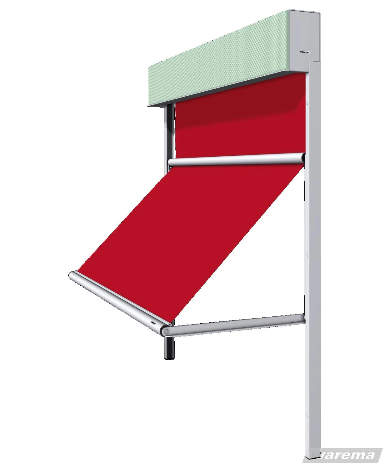 Markise in Rot mit grünem verputzbaren Kasten und Fallarm