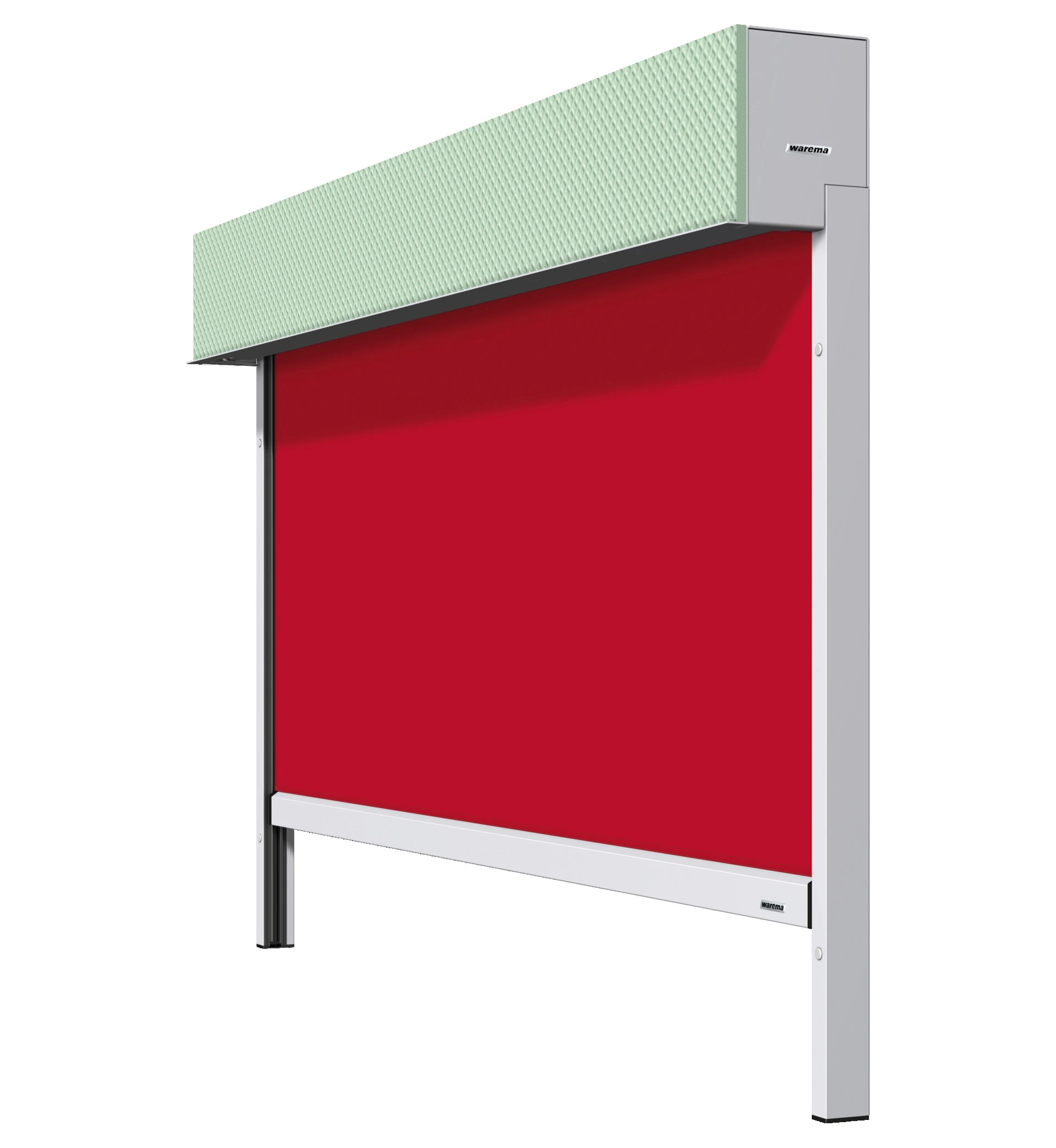 Markise in Rot mit grünem verputzbaren Kasten und easyZIP-Führung